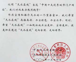 天水在線當(dāng)選“2007中國十大優(yōu)秀城市門戶網(wǎng)站”