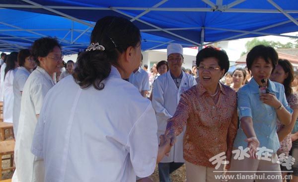 陳至立十分關(guān)心我市“母親健康快車(chē)”項(xiàng)目實(shí)施工作。她驅(qū)車(chē)來(lái)到麥積區(qū)麥積鎮(zhèn)中心衛(wèi)生院,實(shí)地了解婦女衛(wèi)生保健情況。在聽(tīng)取了我市項(xiàng)目實(shí)施情況的匯報(bào)后,陳至立來(lái)到義診點(diǎn)前,向現(xiàn)場(chǎng)義診的醫(yī)務(wù)人員詢問(wèn)工作中遇到的困難,并與他們一一握手。當(dāng)了解到來(lái)自清水縣的劉萬(wàn)芳母子就是“母親健康快車(chē)”的受益者時(shí),陳至立抱起孩子并送上了禮物。陳至立指出,“母親健康快車(chē)”項(xiàng)目是一項(xiàng)民心工程,各級(jí)組織一定要高度重視,認(rèn)真實(shí)施,使其真正成為婦女的“救命車(chē)”、“娘家車(chē)”。