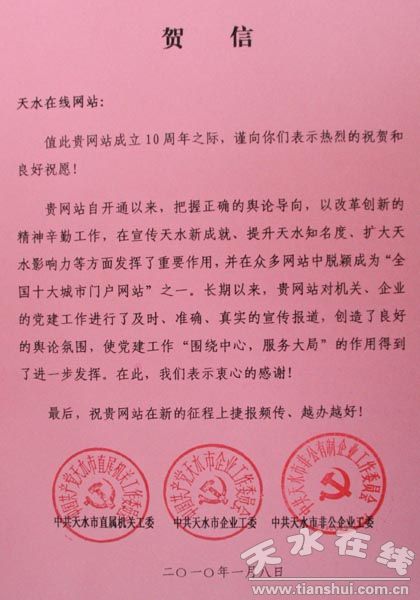 天水市機(jī)關(guān)工委致天水在線成立十周年賀信(圖)