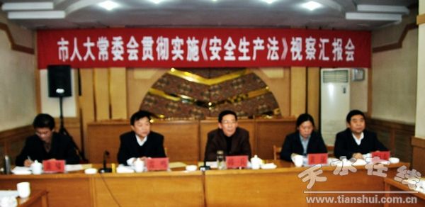 隨后在市迎賓館由市人大常委會(huì)副主任韓一兵主持召開了匯報(bào)會(huì),視察組一行聽取了市安監(jiān)局局長(zhǎng)雷天錄代表市政府作的關(guān)于貫徹實(shí)施《中華人民共和國(guó)安全生產(chǎn)法》和《甘肅省安全生產(chǎn)條例》的情況匯報(bào)。