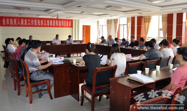 2012年8月10日上午,全市殘疾人康復(fù)工作暨殘疾兒童康復(fù)救助項目會議在市殘聯(lián)四樓會議室召開,市殘聯(lián)理事長劉中秋、副理事長趙振林、市仁和醫(yī)院、市退休醫(yī)師醫(yī)院、市皮膚病?漆t(yī)院院長,縣區(qū)殘聯(lián)分管殘疾人康復(fù)工作的理事長、康復(fù)股長以及市用品用具供應(yīng)站、市康復(fù)中心全體人員共30多人參加了會議。