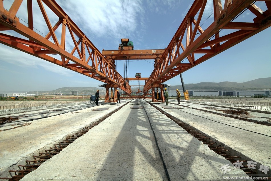 2.社棠渭河大橋工程:該工程位于天水市麥積區(qū)社棠工業(yè)開發(fā)區(qū)規(guī)劃四號路,是連接開發(fā)區(qū)南北兩區(qū)的重要橋梁。大橋北與園區(qū)5號路平交,向南跨渭河與園區(qū)7號路平交。主橋長331.4m,寬20m,引道及連接線長502.36米,寬24米,概算投資5104萬元,計劃工期2012年11月至2014年9月。目前橋梁下部結(jié)構(gòu)全部完成,正在進行箱梁架設(shè)工作。