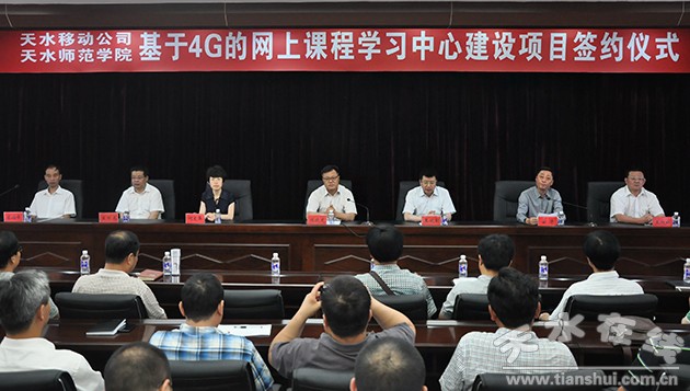 7月3日上午,天水師范學(xué)院與甘肅移動(dòng)天水分公司基于4G的網(wǎng)上課程學(xué)習(xí)中心建設(shè)項(xiàng)目簽約儀式在天水師范學(xué)院隆重舉行。天水師范學(xué)院將與天水移動(dòng)公司攜手在學(xué)校信息中心系統(tǒng)平臺(tái)和數(shù)據(jù)機(jī)房建設(shè)、無線校園網(wǎng)建設(shè)、數(shù)字化校園應(yīng)用支撐平臺(tái)、數(shù)字化校園應(yīng)用系統(tǒng)、網(wǎng)上課程學(xué)習(xí)中心建設(shè)等方面進(jìn)行深度合作。