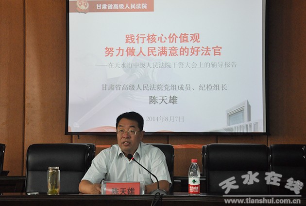 (甘肅省高院紀檢組長陳天雄做“踐行政法核心價值觀,做人民滿意的好法官”的輔導報告。)