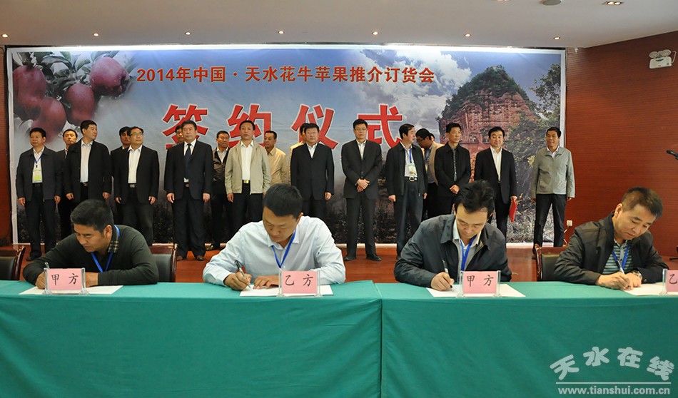 簽約儀式上,天水百富佳果品有限公司與山東省龍口東引果蔬有限公司、天水仲林果品有限公司與重慶津津商貿(mào)有限公司、天水花牛果品公司與長春果品中心批發(fā)市場、天水花牛蘋果(集團)有限責(zé)任公司與法國邁夫諾達公司、天水花牛蘋果(集團)有限責(zé)任公司與上海卜峰蓮花超市、天水在線網(wǎng)店與麥積區(qū)花牛鎮(zhèn)果農(nóng)武正全等我市83戶果品經(jīng)銷企業(yè)與168戶國內(nèi)外知名果品經(jīng)銷企業(yè)簽訂果品訂單購銷協(xié)議。共簽約購銷總量22萬噸,購銷金額達19.8億元。其中現(xiàn)場20戶簽約5.3萬噸,簽約金額4.77億元。