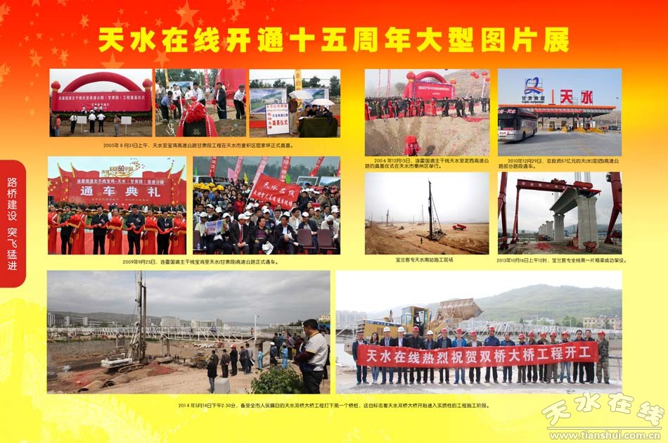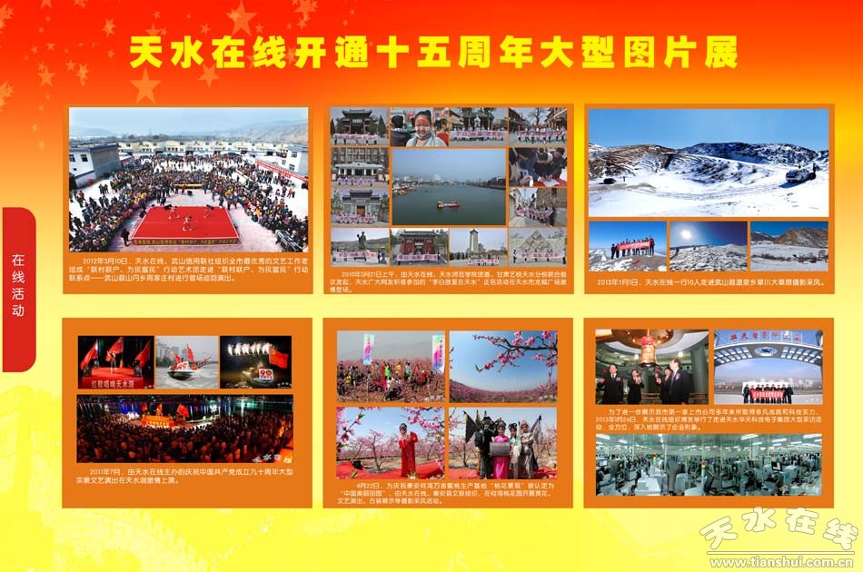 十五年間,天水在線覆蓋到天水的角角落落,影響到天水人生活的方方面面。天水在線拍攝的上百萬(wàn)張圖片,用鏡頭真實(shí)記錄了發(fā)生在天水大地上的大事要事,成為天水在線的寶貴財(cái)富。在今年“兩會(huì)”期間,天水在線舉辦“天水在線成立十五周年大型圖片展”。旨在展示天水在線成立十五年來(lái)見(jiàn)證記錄天水發(fā)展中的部分重大事件與輝煌成就,進(jìn)一步激發(fā)全市人民熱愛(ài)天水、建設(shè)天水的熱情,為推動(dòng)天水跨越發(fā)展和建設(shè)區(qū)域性現(xiàn)代化大城市做出新的更大貢獻(xiàn)。