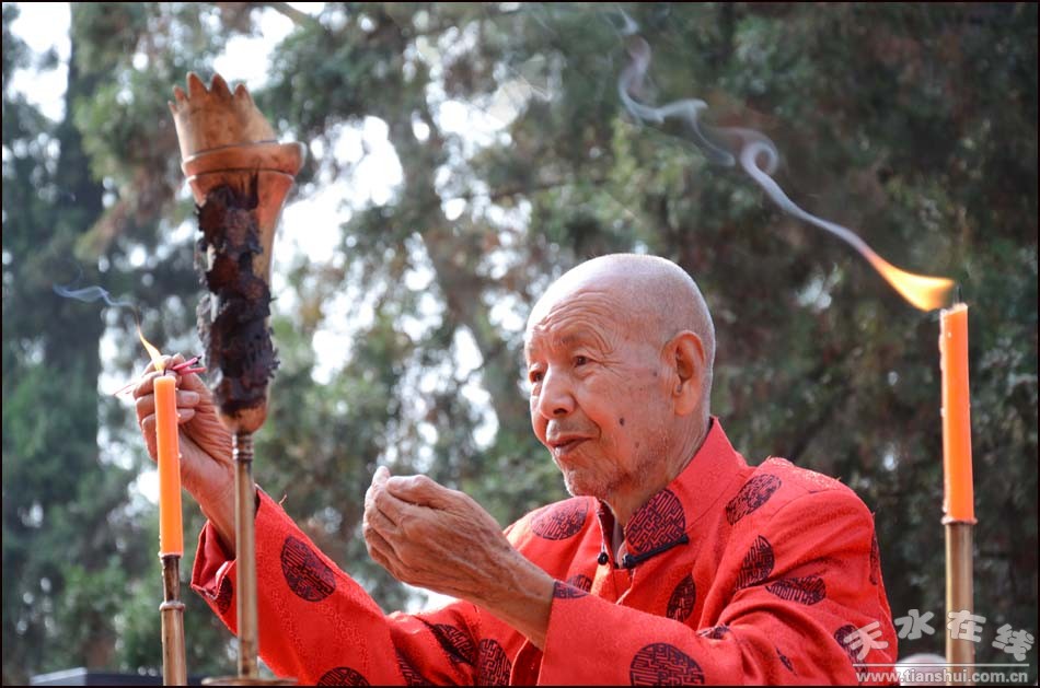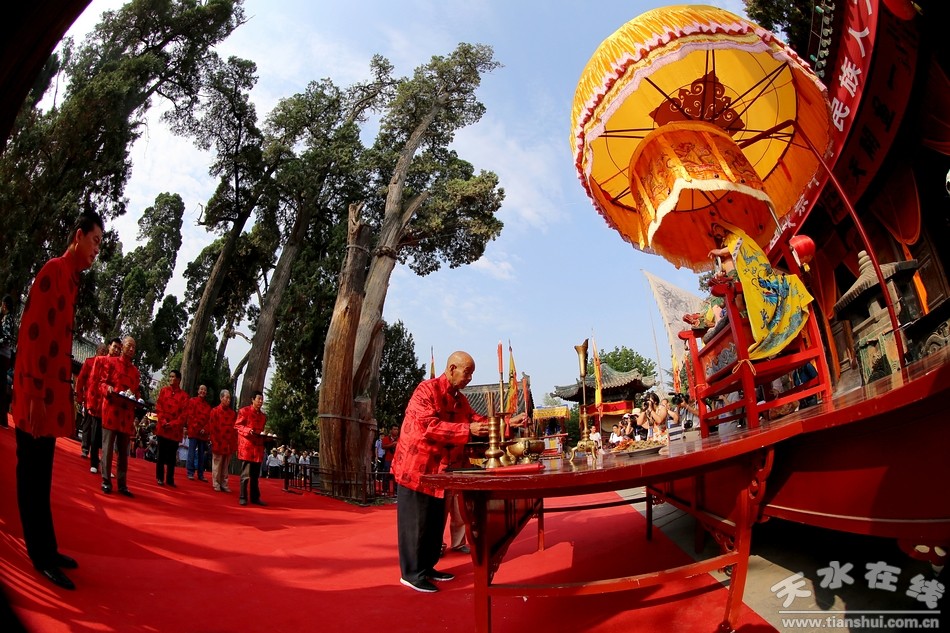 8月31日,天水伏羲廟內(nèi)龍旗獵獵,嗩吶陣陣,在先天殿月臺伏羲行像前悠揚的古琴演奏聲中,浩大的祭祀隊伍按照傳統(tǒng)禮儀,舉行迎神,取圣水,出榜文等儀式,標志著乙未(2015)年秋祭中華民族人文始祖太昊伏羲氏典禮正式開始,數(shù)萬市民和游客觀看了第一天的祭祀典禮儀式。