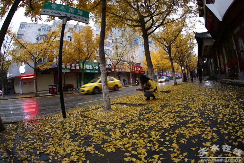 初冬的古城天水,街道兩旁的銀杏樹披上了金裝,如站崗的士兵,颯姿英爽,成了一道靚麗的風(fēng)景線。17日,天水出現(xiàn)了小雨和吹風(fēng)天氣,地面上鋪滿了被風(fēng)吹落的銀杏黃葉,確有一番“滿城盡帶黃金甲”的感覺。(姚延鋒)
