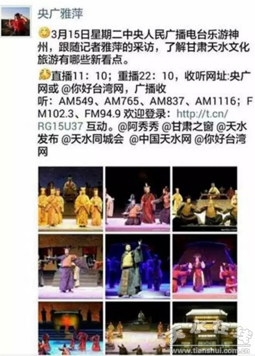 3月15日上午11:10,中央人民廣播電臺(tái)中華之聲“樂(lè)游神州”欄目以17分鐘時(shí)長(zhǎng)的專題直播了《天水文化旅游新看點(diǎn)》,并在當(dāng)晚進(jìn)行了重播。節(jié)目從《大秦文公》進(jìn)京演出及劇目創(chuàng)排、藝術(shù)價(jià)值、現(xiàn)實(shí)意義等方面切入,講述了天水市如何通過(guò)文藝作品的創(chuàng)作生產(chǎn)實(shí)現(xiàn)文化和旅游的深度融合。節(jié)目中配以天水籍在京音樂(lè)人鐘林創(chuàng)作演唱的歌曲《家在天水》,將天水元素表現(xiàn)的淋漓盡致。
