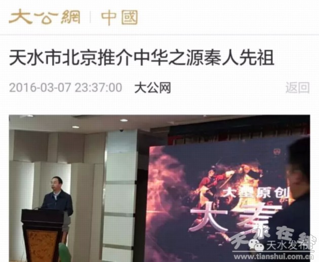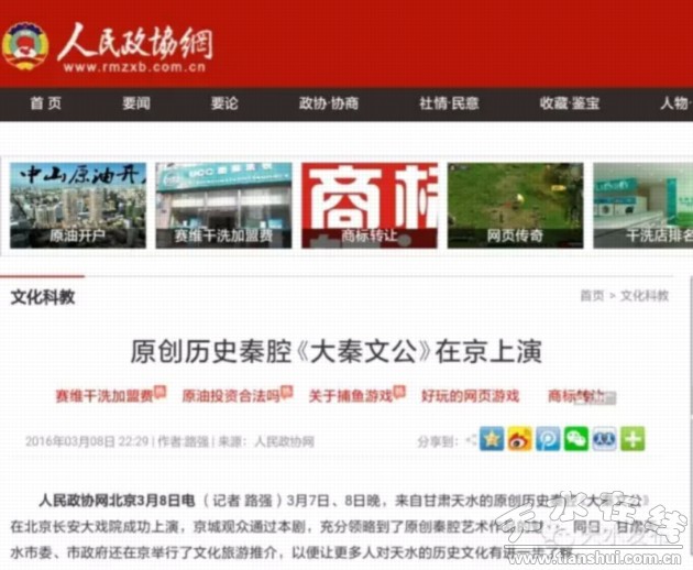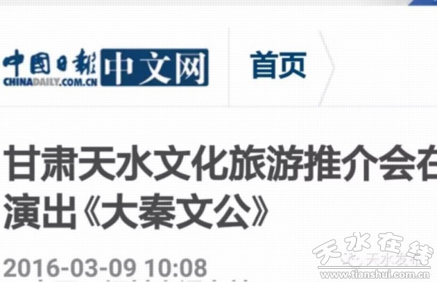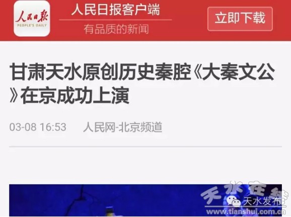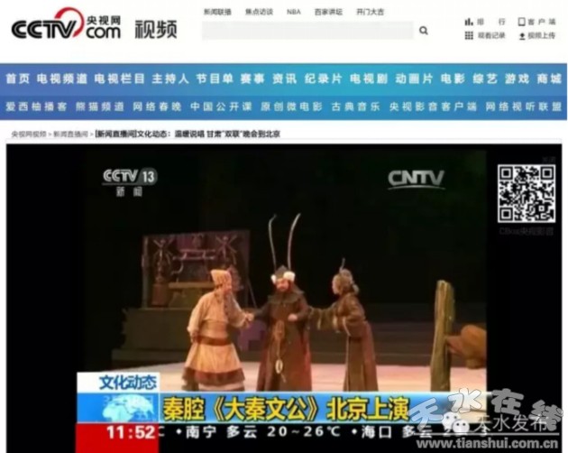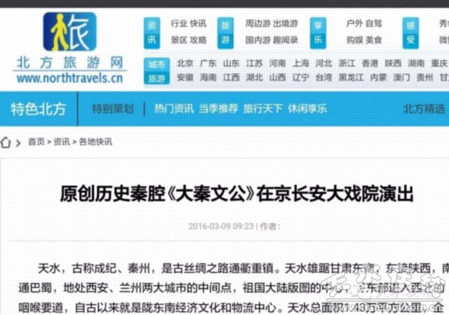3月18日,在全國(guó)“兩會(huì)”剛結(jié)束,CCTV--新聞?lì)l道在“新聞直播間”欄目就播出“秦腔《大秦文公》北京上演”的新聞,報(bào)道說(shuō):“一部填補(bǔ)秦早期歷史空白題材的秦腔《大秦文公》在北京長(zhǎng)安大戲院連演兩場(chǎng),這部由甘肅天水市西秦腔研究院創(chuàng)排的歷史秦腔,深入挖掘當(dāng)?shù)氐臍v史遺存,首次以舞臺(tái)劇形式講述一統(tǒng)天下的大秦帝國(guó)先祖依法治國(guó)的戰(zhàn)略思想,和在秦國(guó)發(fā)源地甘肅天水跌宕起伏的發(fā)跡史,既宣傳了大秦早期文化,又為促進(jìn)為西部欠發(fā)達(dá)地區(qū)的文化藝術(shù)創(chuàng)造力進(jìn)行了有力探索,擴(kuò)大了甘肅天水文化的影響力和知名度”。