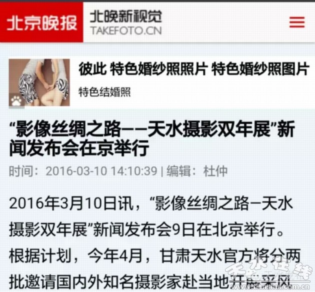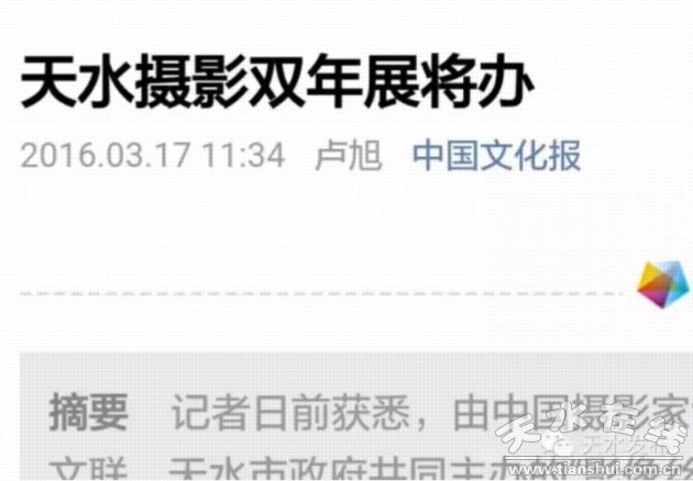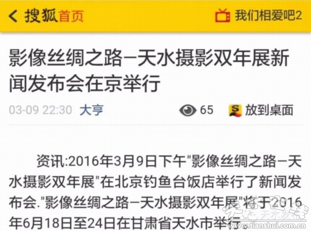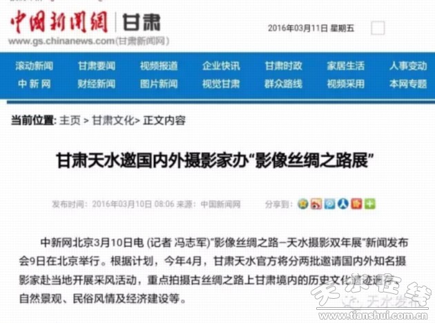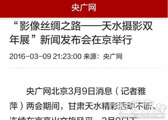 3月9日,人民網(wǎng)以“天水?dāng)z影雙年展將于6月舉辦 盡顯絲路風(fēng)”的標(biāo)題,對(duì) “影像絲綢之路——天水?dāng)z影雙年展”舉辦 的主題、背景、內(nèi)容、特點(diǎn)、優(yōu)勢(shì)以及籌備情況進(jìn)行了全面的介紹報(bào)道。