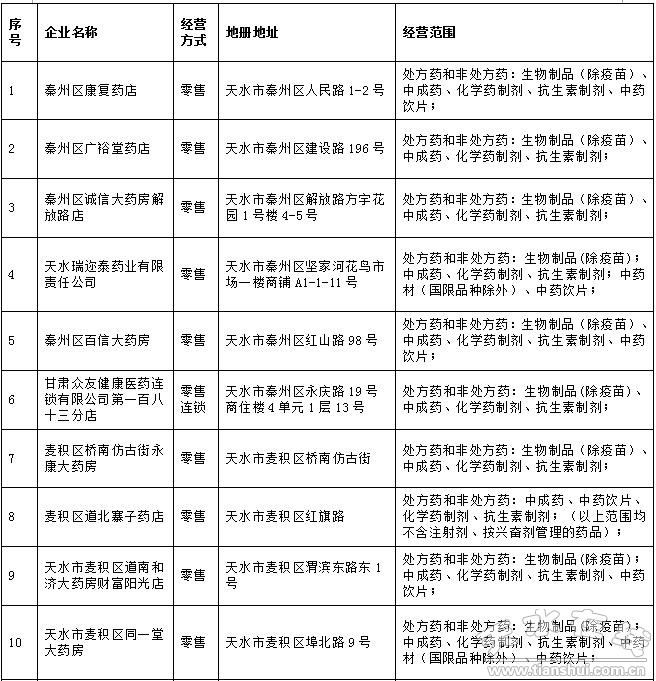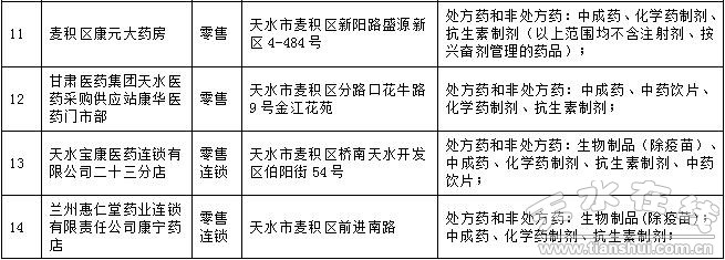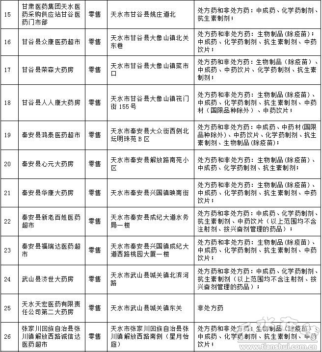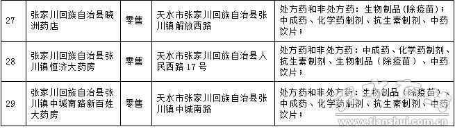 2016年5月16日至7月10日,天水市食品藥品監(jiān)督管理局對轄區(qū)56家藥品零售企業(yè)進(jìn)行了飛行檢查。檢查中發(fā)現(xiàn)秦州區(qū)康復(fù)藥店等29戶藥品零售企業(yè)存在嚴(yán)重違反《藥品經(jīng)營質(zhì)量管理規(guī)范》的行為,依據(jù)《藥品醫(yī)療器械飛行檢查辦法》第二十五條之規(guī)定。決定收回上述企業(yè)《藥品經(jīng)營質(zhì)量管理規(guī)范認(rèn)證證書》,現(xiàn)予公告。