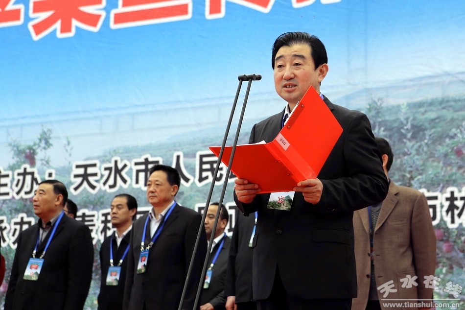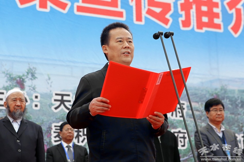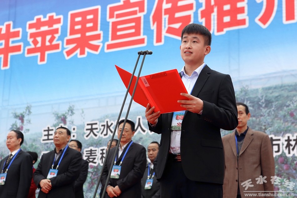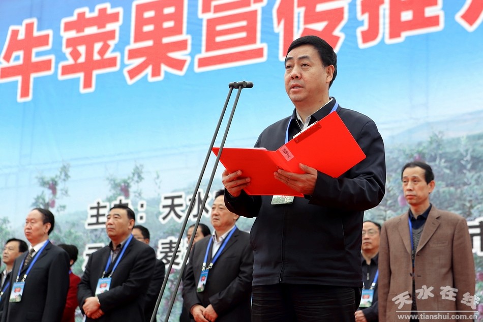 天水市政府秘書長逯克宗宣讀《天水市人民政府關(guān)于命名花牛蘋果標準化示范基地和表彰花牛蘋果大獎賽獲獎產(chǎn)品的決定》