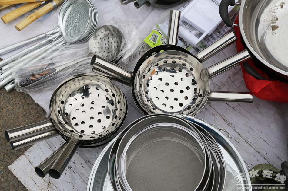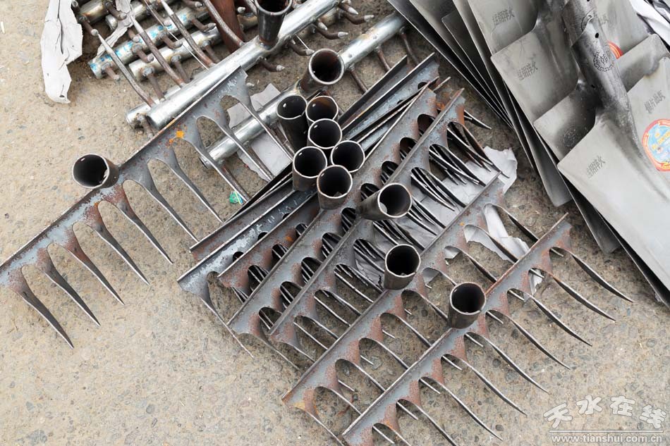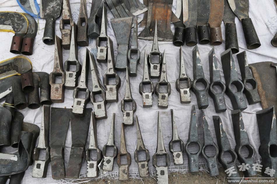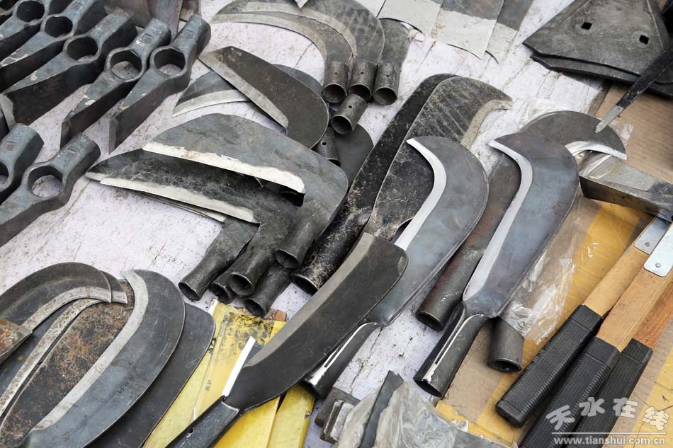 種類(lèi)繁多的山貨市場(chǎng)可不只有這些編織類(lèi)農(nóng)用物品,鐵制品在農(nóng)民生活中也是重頭戲。各式各樣的鋤頭、鐵鏟、鐮刀、草耙等整齊地?cái)[放在地上,從莊家前期除草、碎土,到后期種耕,再到最后收獲等,一系列種地過(guò)程中所需的工具齊聚一堂,任由挑選?匆(jiàn)這些工具仿佛看見(jiàn)了一望無(wú)際的田地,在暖陽(yáng)中只待農(nóng)民伯伯悉心呵護(hù)。