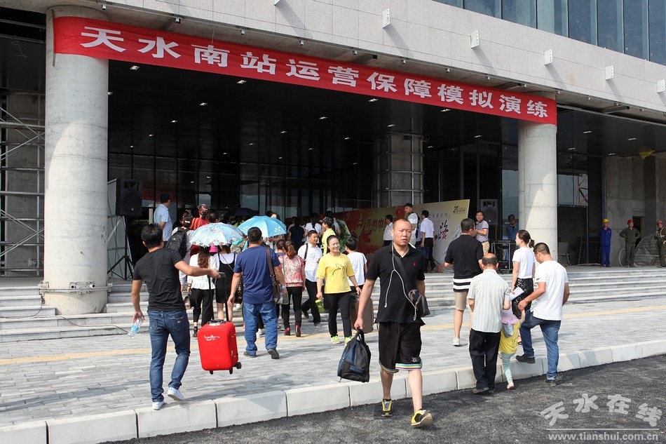 這次模擬演練是為7月初寶蘭高鐵正式開通做最后準(zhǔn)備。按照預(yù)案,指揮組下設(shè)綜合協(xié)調(diào)、客運、治安、保暢和市場秩序、站務(wù)、乘客、施工管理等8個小組,演練期間將有2列高鐵?刻焖险尽Q菥毈F(xiàn)場分7個區(qū)域,共組織6輛執(zhí)法車、80余名執(zhí)法人員和武警戰(zhàn)士、消防官兵維持現(xiàn)場秩序。有3輛公交車、20輛出租車、5輛私家50多名工作人員、200名乘客、20余名客運公司的管理人員共同參加演練。旨在通過全方位、多角度、全覆蓋式的模擬演練,全面檢驗天水南站及站前廣場硬件設(shè)施和服務(wù)人員的綜合服務(wù)保障功能。整個演練過程,執(zhí)法工作人員各負其責(zé)、各司其職,秩序井然,圓滿完成了演練程序,達到了預(yù)期效果。通過模擬演練,天水南站綜合交通樞紐已經(jīng)具備高鐵開通運營保障的條件。