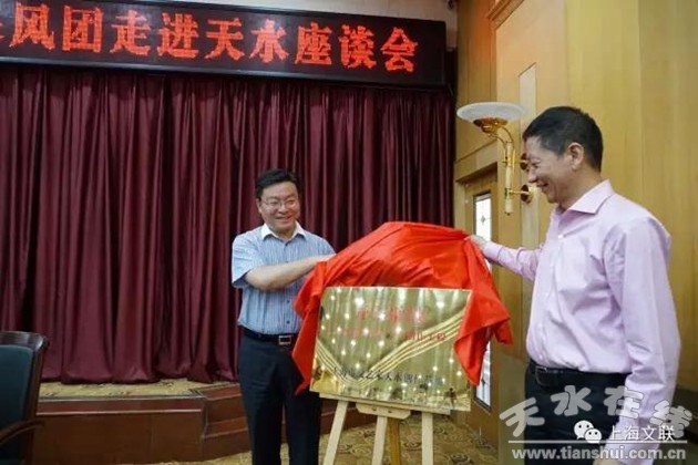 ▲“上海市文藝家天水創(chuàng)作基地”揭牌儀式,天水市委常委、副市長(zhǎng)李曉東和上海市文聯(lián)黨組書(shū)記、專職副主席尤存揭牌