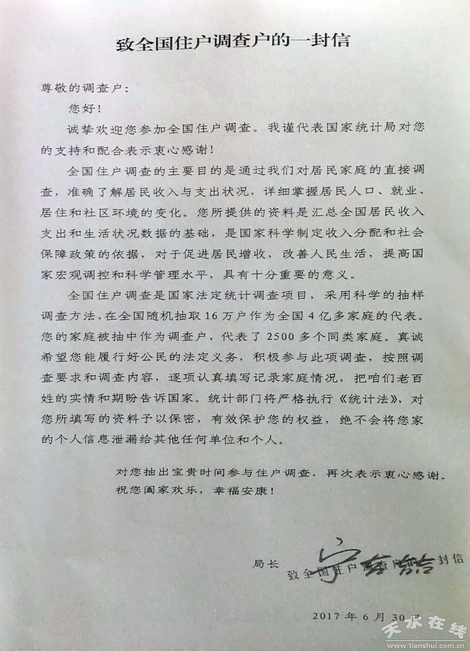 今年8~11國家統(tǒng)計局天水調(diào)查隊將開展新一輪住戶調(diào)查樣本輪換工作,并將在全市通過PPS抽樣方法,抽選1050戶家庭作為2018年至2020年調(diào)查樣本參與住戶調(diào)查記賬工作。摸底調(diào)查期間,將有天水調(diào)查隊工作人員持調(diào)查證入戶填報摸底調(diào)查問卷,希望廣大居民充分理解和密配合。