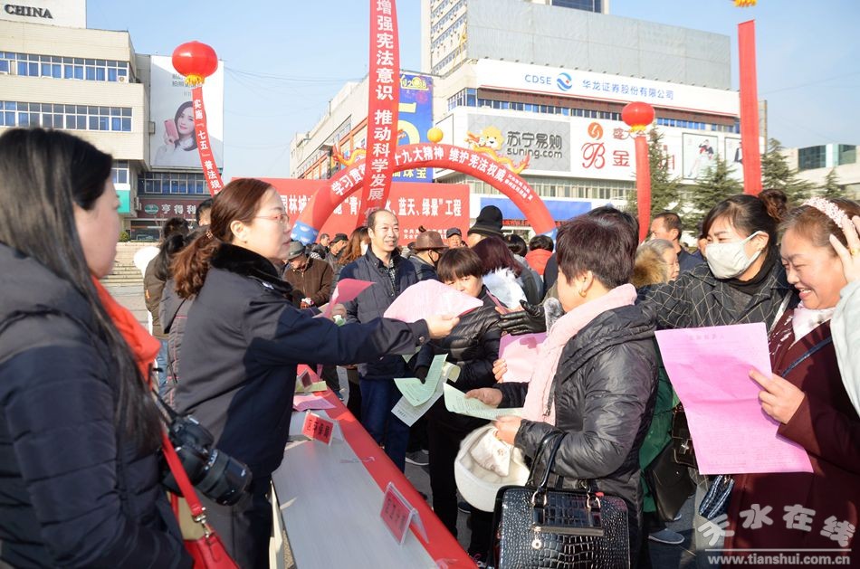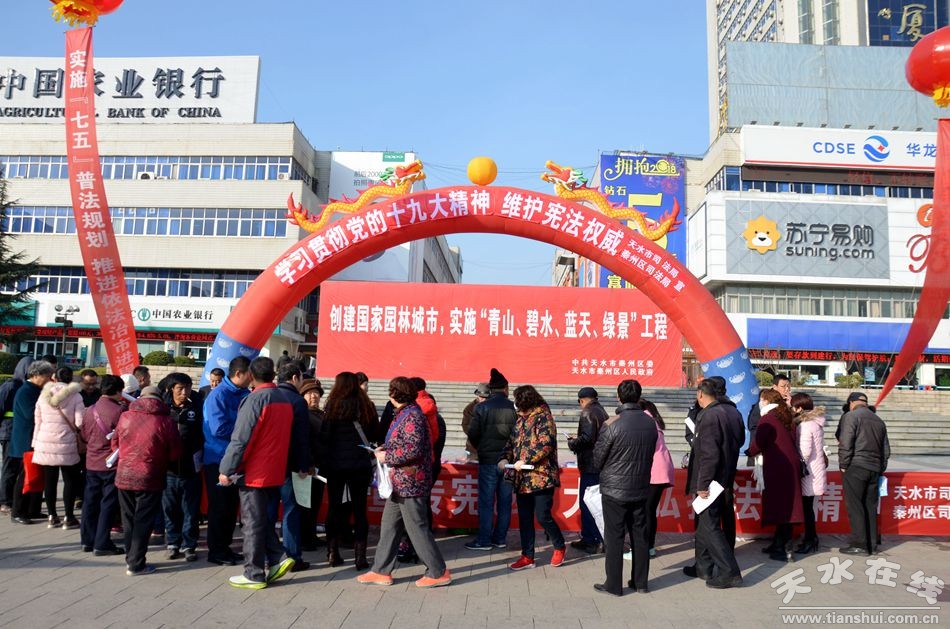 為深入貫徹黨的十九大精神,增強(qiáng)全民法治觀念,弘揚(yáng)憲法精神,樹立憲法意識(shí),維護(hù)憲法權(quán)威。12月4日,天水市司法局、秦州區(qū)司法局組織市區(qū)40家政法機(jī)關(guān)和行政執(zhí)法單位,在龍城廣場(chǎng)開展了以“學(xué)習(xí)貫徹黨的十九大精神 維護(hù)憲法權(quán)威”為主題的2017年國(guó)家憲法日暨全國(guó)法治宣傳日集中宣傳活動(dòng)。