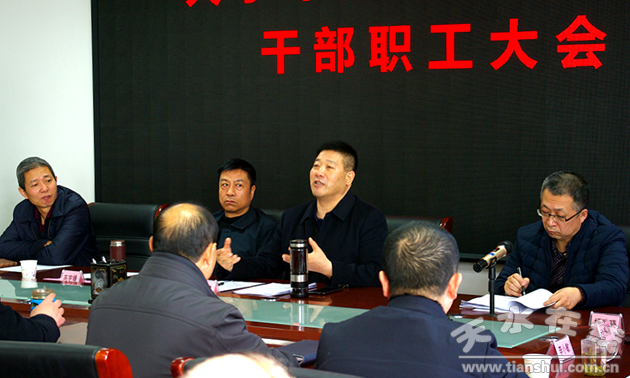 2018年2月22日,即春節(jié)長(zhǎng)假之后的第一天,上班伊始,天水市文化和旅游局黨組書(shū)記、局長(zhǎng)李玉進(jìn)同志即組織召開(kāi)全局干部職工大會(huì),就當(dāng)前和今后一段時(shí)期的文化旅游重點(diǎn)工作進(jìn)行了研究部署。局黨組班子全體成員,局機(jī)關(guān)全體干部職工60余人參加了會(huì)議。