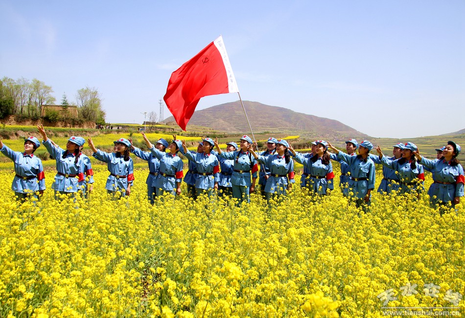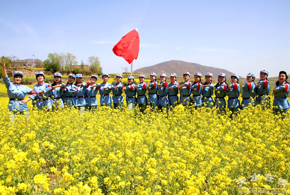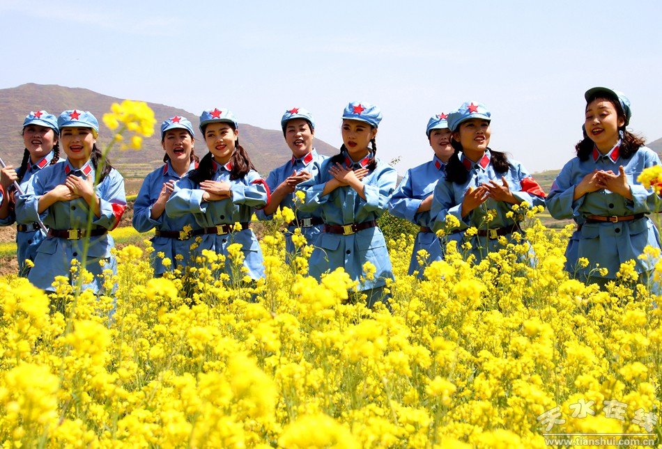 當(dāng)日的龍臺鎮(zhèn)大莊村,油菜花田為舞臺,山川大地為背景,藝術(shù)家們用歌聲贊美山川,歌頌大地的主人。旋鼓舞表演鏗鏘有力,琵琶、古箏要把最美的高山流水之音彈奏給大地聽,情歌對唱抒發(fā)我們最真摯的內(nèi)心情感,武術(shù)表演生龍活虎,葫蘆絲把“友誼地久天長”演繹的淋漓盡致,而英姿颯爽的“紅色娘子軍們”用歌聲贊美祖國的大好山河。 (從1935年9月至1936年10月,紅一、二、四方面軍主力部隊(duì)先后三次經(jīng)過武山縣。)如微風(fēng)吹過的田野,油菜花逐浪排開,表演精彩紛呈激情澎湃。由武山縣委宣傳部和天水在線策劃的《在希望的田野上》“快閃”更是把整個演出活動推向了高潮,驚艷了大地。油菜花田和藝術(shù)元素的完美結(jié)合,集中展現(xiàn)了武山縣脫貧攻堅(jiān)、精神文明、生態(tài)建設(shè)、全域旅游、美麗鄉(xiāng)村建設(shè)的巨大成就。