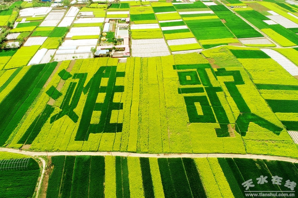 花為媒,大地飛歌。像河流匯入海洋,灘歌的油菜花梯田由高而低,由遠(yuǎn)及近也漸次匯聚在了漆莊村的川地里。放眼望去,眼前由麥田組成的碩大而又碧綠的“灘歌”字樣像極了兩顆超大的翡翠鑲嵌在了金黃色的油菜花海里。像平靜的湖面、像大漠中的綠洲、像大海中的航帆,一汪碧綠被重重金色的錦緞包裹封存,幸福也像被凝結(jié)在了這秀美的山川間。