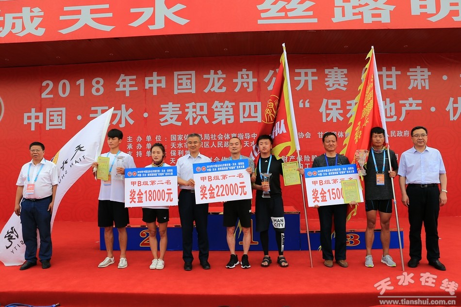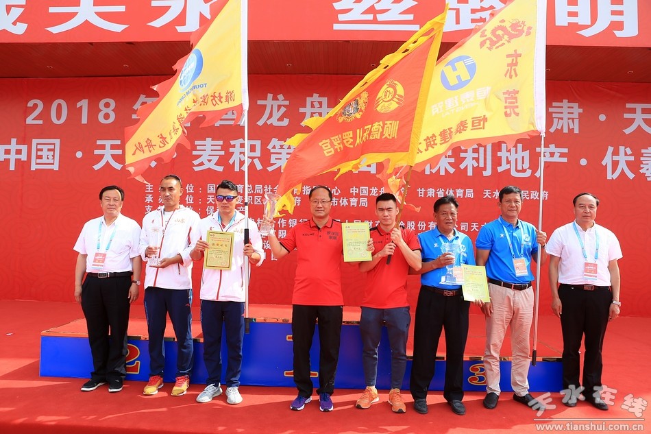 (為獲得甲B組200米直道賽前三名的秦州區(qū)龍舟隊、秦安縣龍舟隊、天水師范學(xué)院晟泰龍舟隊頒獎。)