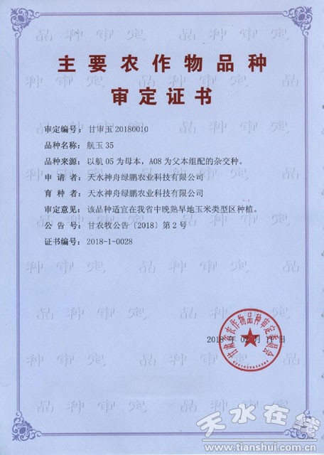 天水國家農(nóng)業(yè)科技園區(qū)入園企業(yè)天水神舟綠鵬公司歷經(jīng)16年的玉米航天育種,新育成了中晚熟玉米雜交種航玉35通過甘肅省品種審定,審定編號為甘審玉20180010,這也是利用航天育種技術(shù)育成的首個(gè)航天玉米新品種。
