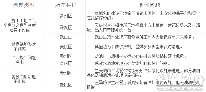 12月17日至23日,天水市大氣辦組織相關(guān)人員對(duì)秦州區(qū)、麥積區(qū)、甘谷縣、武山縣“冬防”措施落實(shí)情況進(jìn)行了現(xiàn)場(chǎng)調(diào)度,工作組以“散亂污”企業(yè)、建筑工地、“四燒”以及網(wǎng)格化監(jiān)管等為重點(diǎn),共檢查125個(gè)點(diǎn)位,發(fā)現(xiàn)突出問題94個(gè),主要涉及施工揚(yáng)塵、燃煤鍋爐管控、餐飲油煙治理、“四燒”管控等方面。