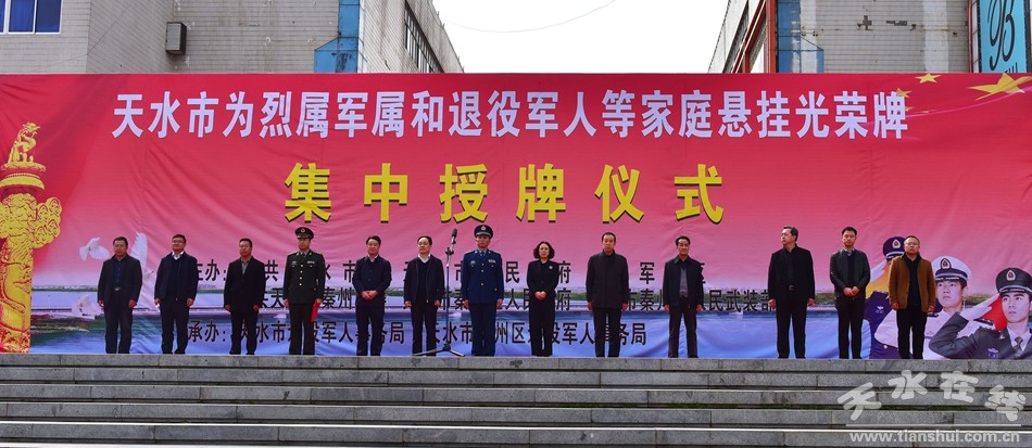 3月21日下午,天水市為烈屬和退役軍人等家庭懸掛光榮牌集中授牌儀式在龍城廣場舉行。市委常委、天水軍分區(qū)司令員劉甫清,副市長王燕,市政協(xié)副主席郭明興出席授牌儀式。秦州區(qū)人武部、區(qū)人大、區(qū)政協(xié)相關(guān)負(fù)責(zé)人,各鄉(xiāng)鎮(zhèn)、街道分管領(lǐng)導(dǎo),區(qū)直部門干部職工及退役軍人代表約800人參加授牌儀式。