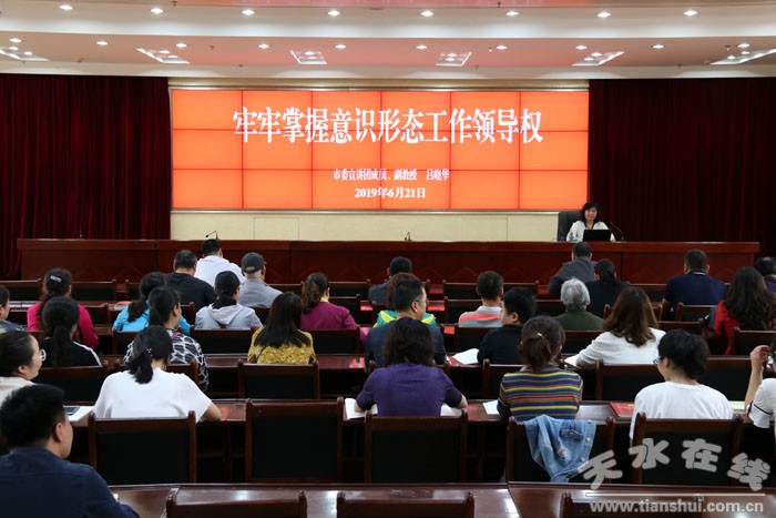 6月21日下午,天水市自然資源局和岷山社區(qū)黨組織聯(lián)合舉辦“百人百課百講”宣講活動(dòng)報(bào)告會(huì),邀請(qǐng)市委宣講團(tuán)成員、副教授呂曉華做了題為《牢牢掌握意識(shí)形態(tài)工作領(lǐng)導(dǎo)權(quán)》的輔導(dǎo)報(bào)告。市自然資源局、岷山社區(qū)60多名黨員干部聆聽了報(bào)告。