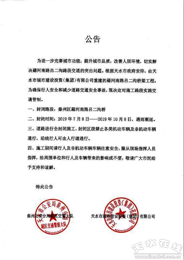 為進(jìn)一步完善城市功能,提升城市品質(zhì),改善人居環(huán)境,切實(shí)解決藉河南路呂二溝路段交通的突出問題。根據(jù)天水市政府安排,由天水市城市建設(shè)投資(集團(tuán))有限公司重建的藉河南路呂二溝橋梁工程。為確保行人安全和減少道路交通安全事故,現(xiàn)決定對(duì)施工路段實(shí)施交通管制。