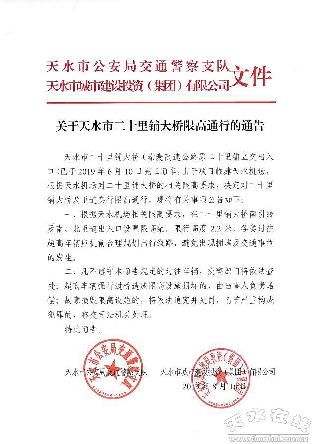 天水市二十里鋪大橋(秦麥高速公路原二十里鋪立交出入口)已于2019年6月10日完工通車(chē),由于項(xiàng)目臨建天水機(jī)場(chǎng),根據(jù)天水機(jī)場(chǎng)對(duì)二十里鋪大橋的相關(guān)限高要求,決定對(duì)二十里鋪大橋及匝道實(shí)行限高通行,現(xiàn)將有關(guān)事項(xiàng)公告如下: