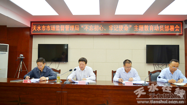 會議傳達(dá)學(xué)習(xí)了市委關(guān)于開展第二批“不忘初心,牢記使命”主題教育動員部署會議精神,印發(fā)了《中共天水市市場監(jiān)督管理局黨組關(guān)于開展“不忘初心,牢記使命”主題教育的實施方案》。市局黨組書記、局長王宏瑋對全系統(tǒng)開展主題教育作動員講話。