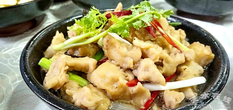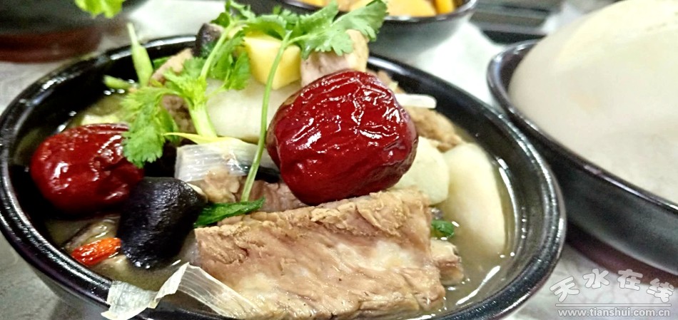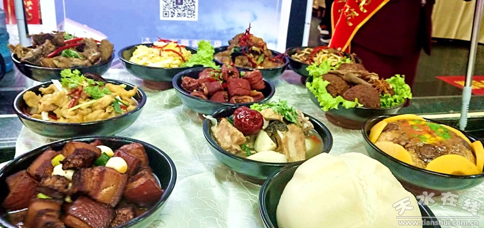 清水十全宴來源于民間已經(jīng)流傳幾百年的清水八碗。當(dāng)?shù)孛耖g節(jié)慶和辦酒席時慣用是待客宴席,其最大的特點是半葷半素、一菜兩味、油而不膩,餐桌上看不到盤子,吃飯及裝菜全部是藍(lán)邊大口碗。隨著生活水平的不斷提高,清水縣金水源大酒店把八碗演變成了十大碗,以十大碗為主,增加了鴨、魚、海鮮、蔬菜搭配等菜肴,上菜時要按順序上,從第一道到最后一道,不能出錯。十大碗葷素搭配,粗細(xì)搭配,擺放有序。