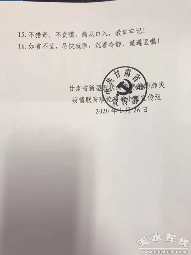 【溫馨提示】全省廣大城鄉(xiāng)居民:大家新春快樂(lè)!為有效防控新型冠狀病毒感染的肺炎,省衛(wèi)生健康委溫馨提示:一、勤快洗手,每次洗手至少20秒。二、常戴口罩,防止呼吸道感染。三、減少外出,避免到人群聚集的地方。四、開(kāi)窗通風(fēng),保持室內(nèi)空氣清新。五、不碰野味,避免接觸野生動(dòng)物。六、不吃生冷,食物徹底煮熟。七、不要恐慌,保持良好心態(tài),不信謠、不傳謠。八、湖北武漢來(lái)甘返甘人員,請(qǐng)主動(dòng)居家隔離14天,密切關(guān)注身體健康狀況。一旦有發(fā)熱、乏力和干咳等呼吸系統(tǒng)癥狀,應(yīng)趕快戴上口罩去當(dāng)?shù)匕l(fā)熱門(mén)診咨詢就醫(yī)!臼⌒l(wèi)生健康委】