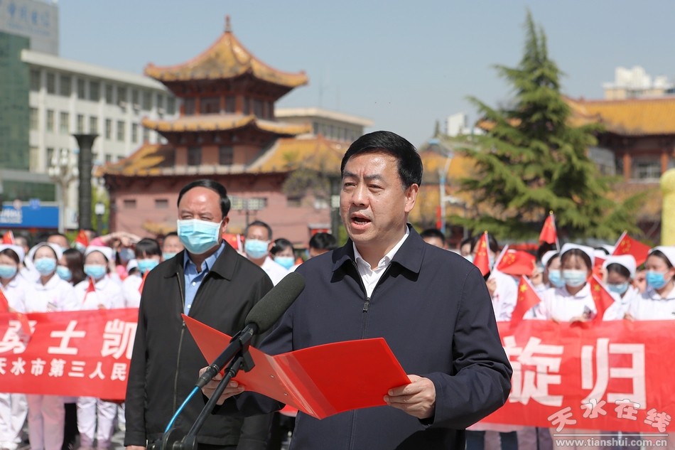 市委、市政府在秦州區(qū)龍城廣場舉行隆重的歡迎儀式,迎接兩位馳援武漢的醫(yī)護(hù)人員回家。市人大常委會主任蔣曉強(qiáng)出席歡迎儀式并為醫(yī)療隊員頒發(fā)“最美天水人”榮譽(yù)證書。市委常委、宣傳部長張建杰,市政協(xié)副主席蘇定武,市人大常委會秘書長楊坤出席歡迎儀式。副市長逯克宗主持歡迎儀式。
