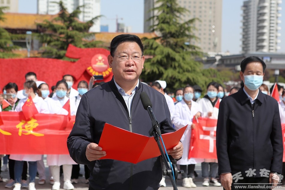 (市人大常委會主任蔣曉強(qiáng)為醫(yī)療隊員頒發(fā)“最美天水人”榮譽(yù)證書)