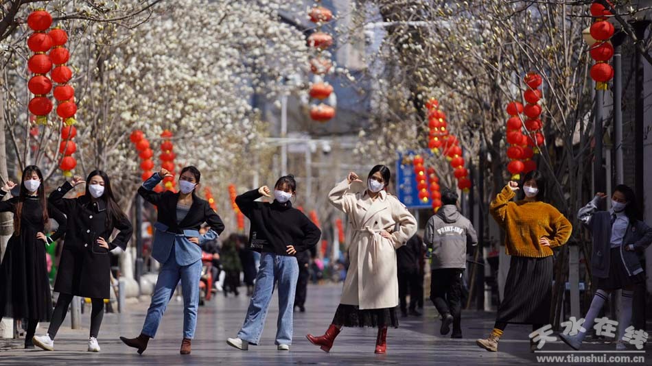 (圖為游客在自由路拍照賞花 天水在線攝于2021年3月6日)