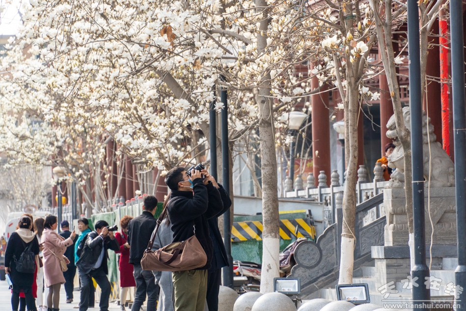 (圖為游客在自由路觀賞玉蘭花 天水在線攝于2021年3月6日)