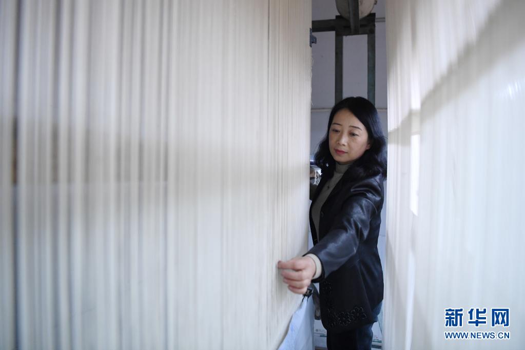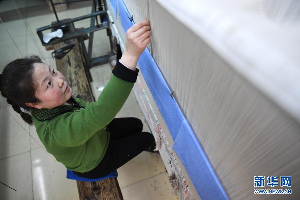 黃晶蓉在天水絲毯織造車間里在整理織線(4月12日攝)。
