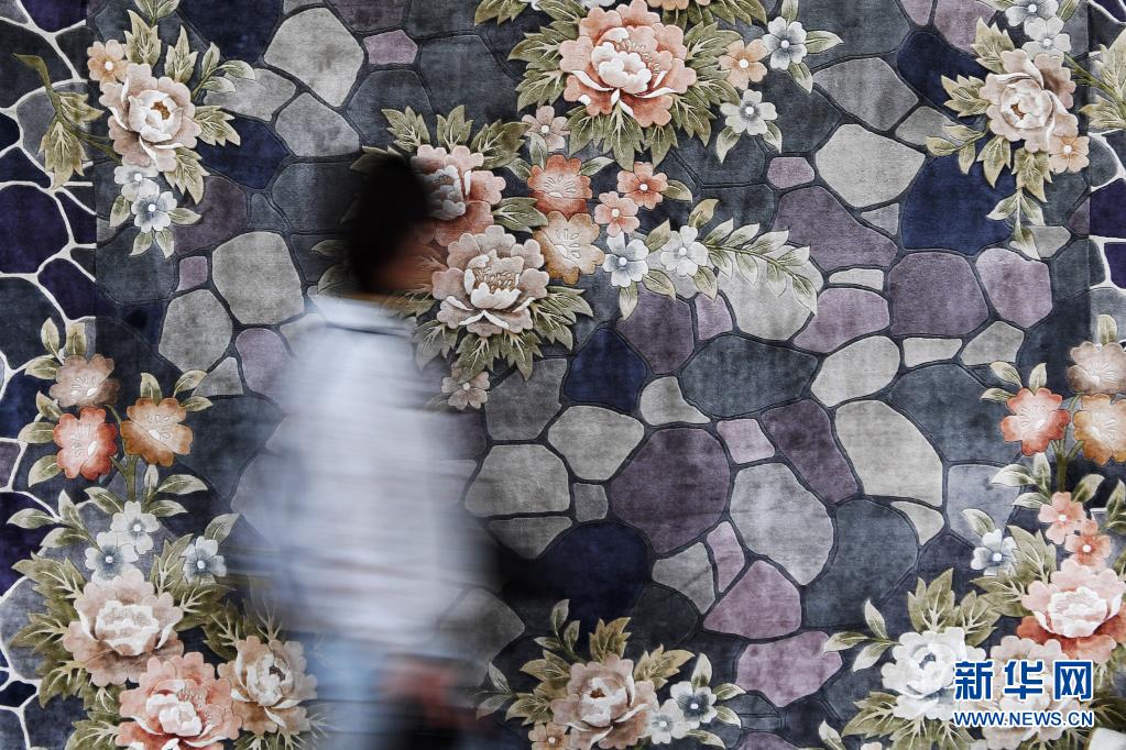 一名參觀者從天水絲毯前走過(4月12日攝)。