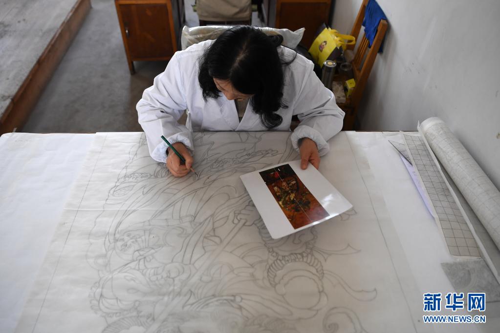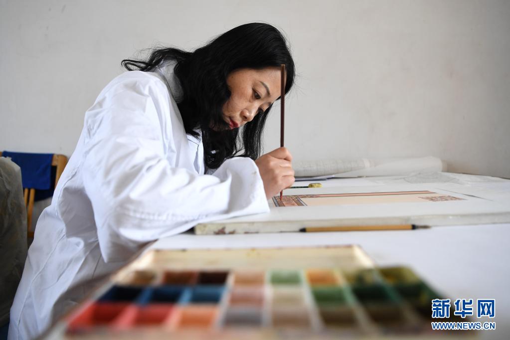 黃晶蓉在畫板上給天水絲毯的設(shè)計(jì)小稿上色(4月12日攝)。