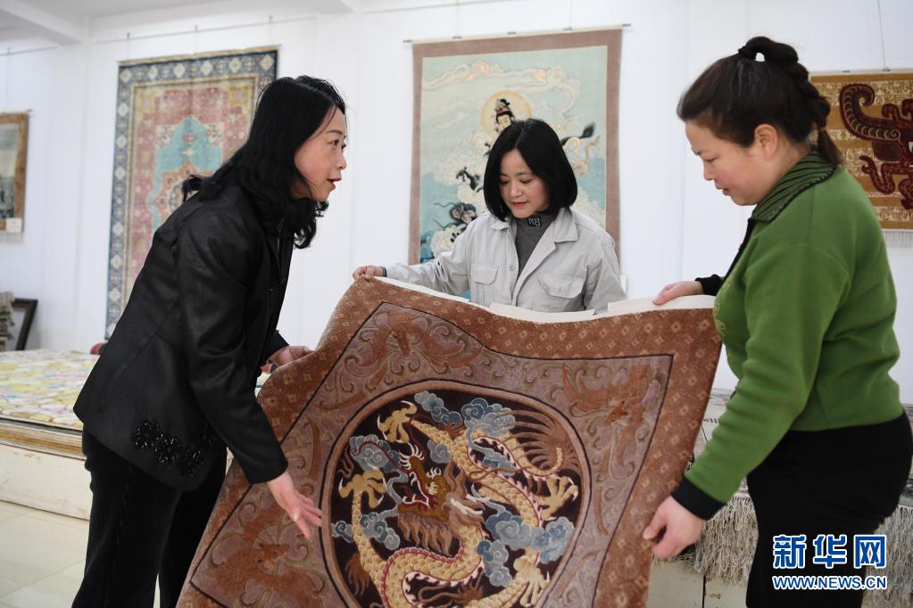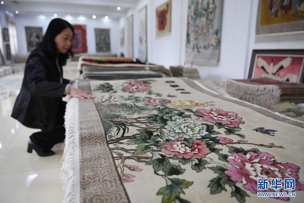黃晶蓉在天水新天絲毯有限公司的成品展室查看絲毯成品(4月12日攝)。