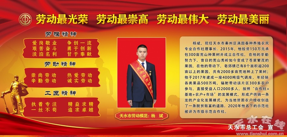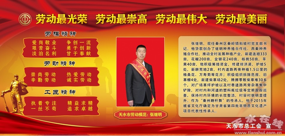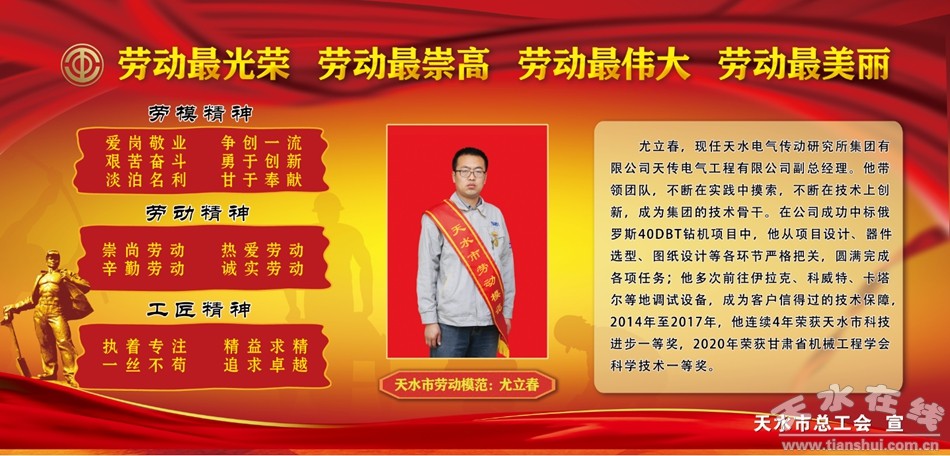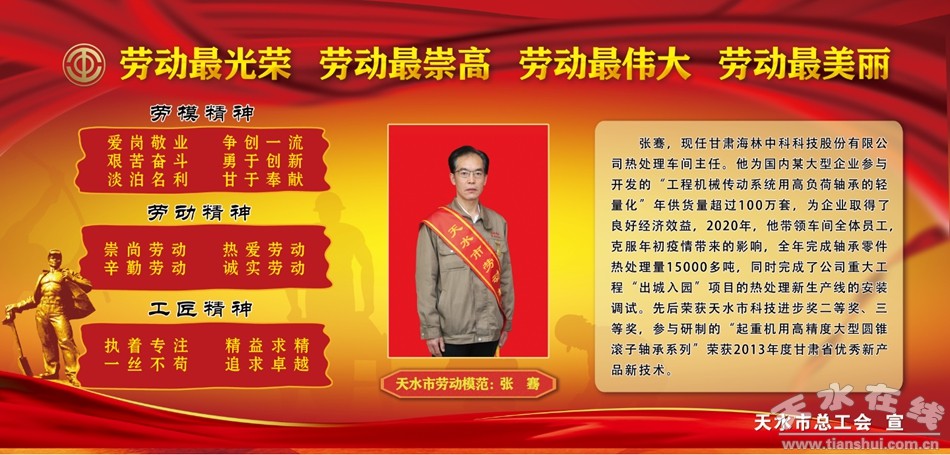 為牢固樹立尊重勞動、尊重知識、尊重人才、尊重創(chuàng)造的鮮明導(dǎo)向,大力弘揚“愛崗敬業(yè)、爭創(chuàng)一流,艱苦奮斗、勇于創(chuàng)新,淡泊名利、甘于奉獻”的勞模精神,鼓勵勞模先進珍惜榮譽、保持本色,謙虛謹慎、戒驕戒躁,繼續(xù)發(fā)揮示范帶頭作用,繼續(xù)在平凡的崗位上創(chuàng)造不平凡的業(yè)績。我們將近幾年全市各行各業(yè)涌現(xiàn)出來的部分勞動模范和先進工作者做一展示,引導(dǎo)激勵廣大勞動者學(xué)習(xí)先進、爭當先進,凝聚加快發(fā)展的強大合力,形成每個勞動者兢兢業(yè)業(yè)、各行各業(yè)比學(xué)趕幫、不同領(lǐng)域競相超越的生動局面。