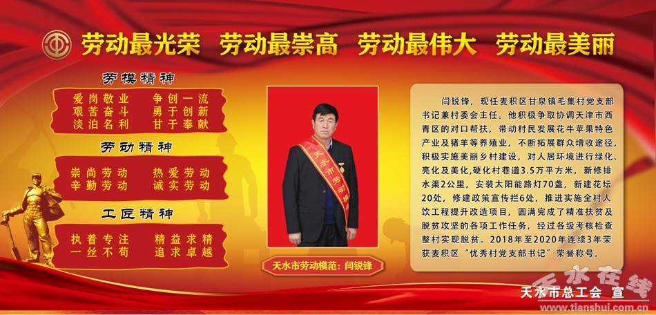 閆銳鋒,現(xiàn)任麥積區(qū)甘泉鎮(zhèn)毛集村黨支部書記兼村委會主任。他積極爭取協(xié)調(diào)天津市西青區(qū)的對口幫扶,帶動村民發(fā)展花牛蘋果特色產(chǎn)業(yè)及豬羊等養(yǎng)殖業(yè),不斷拓展群眾增收途徑,積極實施美麗鄉(xiāng)村建設(shè),對人居環(huán)境進行綠化、亮化及美化,硬化村巷道3.5萬平方米,新修排水渠2公里,安裝太陽能路燈70盞,新建花壇20處,修建政策宣傳攔6處,推進實施全村人飲工程提升改造項目,圓滿完成了精準扶貧及脫貧攻堅的各項工作任務(wù),經(jīng)過各級考核檢查整村實現(xiàn)脫貧。2018年至2020年連續(xù)3年榮獲麥積區(qū)“優(yōu)秀村黨支部書記”榮譽稱號。