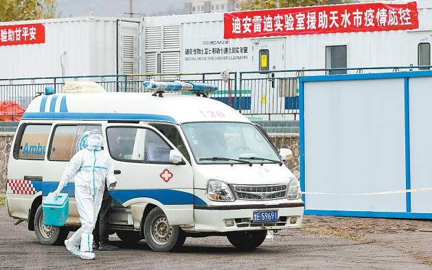 上午10時,120救護車載著當天第一批次樣本來到位于麥積區(qū)城南體育場的方艙實驗室。兩區(qū)采集到的樣本被114臺轉運車輛分別運送到天水市第一人民醫(yī)院等8家醫(yī)療機構和雷迪方艙實驗室等4家第三方實驗室進行檢驗。