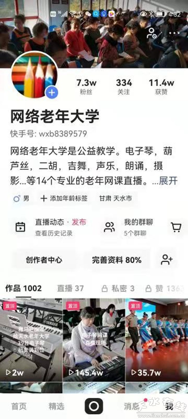 天水老年大學(xué)是“全國示范性老年大學(xué)”。為了融入新時(shí)代,推動(dòng)新發(fā)展,市委老干部局高標(biāo)準(zhǔn)定位、高起點(diǎn)謀劃、高規(guī)格推進(jìn),在強(qiáng)化線下教學(xué)的同時(shí),把更多精力、財(cái)力、物力投入到網(wǎng)絡(luò)教學(xué)上。目前,網(wǎng)絡(luò)學(xué)校開辦專業(yè)14個(gè)、教學(xué)班20個(gè),設(shè)立網(wǎng)絡(luò)工作室1間,配備投影、電視、錄音、攝像、音響等多類網(wǎng)用器材,開辦騰訊、微信、抖音、快手等四個(gè)直播平臺(tái),聘請(qǐng)網(wǎng)絡(luò)專業(yè)人員1名,網(wǎng)絡(luò)教師35名,在線學(xué)員和粉絲突破7萬人次,包括北京、上海、重慶、新疆、浙江、蘭州等地學(xué)員,開創(chuàng)了線上線下融合發(fā)展新模式。網(wǎng)絡(luò)學(xué)校副校長(zhǎng)趙寶賢說,力爭(zhēng)通過三年時(shí)間建成覆蓋全市的網(wǎng)絡(luò)教學(xué)陣地,將網(wǎng)絡(luò)老年大學(xué)拓展延伸到基層,創(chuàng)建為文化養(yǎng)老的一張?zhí)焖?/P>