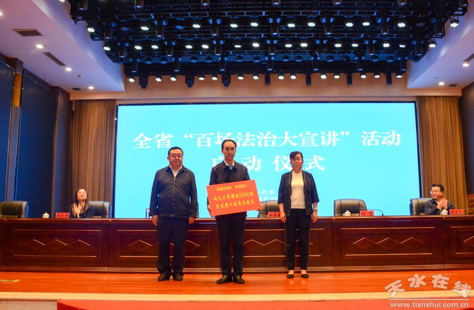 新天水訊【記者 童強】5月26日,由省委宣傳部、省委全面依法治省辦、省司法廳在全省組織開展的“百場法治大宣講”活動啟動儀式在天水舉行。省委宣傳部二級巡視員封奎海,省司法廳黨委委員、副廳長何雯出席啟動儀式,天水市委常委、政法委書記劉天波主持啟動儀式并講話,副市長、市公安局局長郭慶祥致辭。