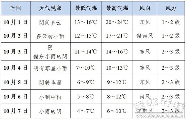 【摘要】預(yù)計(jì)“國(guó)慶”期間我市以陰雨天氣為主,其中2日夜間到3日上午小雨,5日夜間到6日白天小到中雨。受冷空氣影響,4日開(kāi)始?xì)鉁貙⑾陆?~7℃。連續(xù)性降雨導(dǎo)致發(fā)生地質(zhì)災(zāi)害的氣象風(fēng)險(xiǎn)較高,需加強(qiáng)防范。