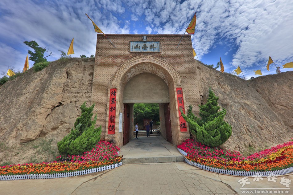 從天水市區(qū)驅(qū)車半小時(shí),即到位于麥積區(qū)三陽(yáng)川的卦臺(tái)山。山高約百米,如倒扣之觚。與各地各處繁華熱鬧的景區(qū)相比,卦臺(tái)山幾乎屬于未開(kāi)發(fā)狀態(tài),僅登山之臺(tái)階,道旁之綠樹(shù)而已,亦未見(jiàn)游客。因剛從講堂下來(lái),主客俱西裝革履,倒多了一分莊重。